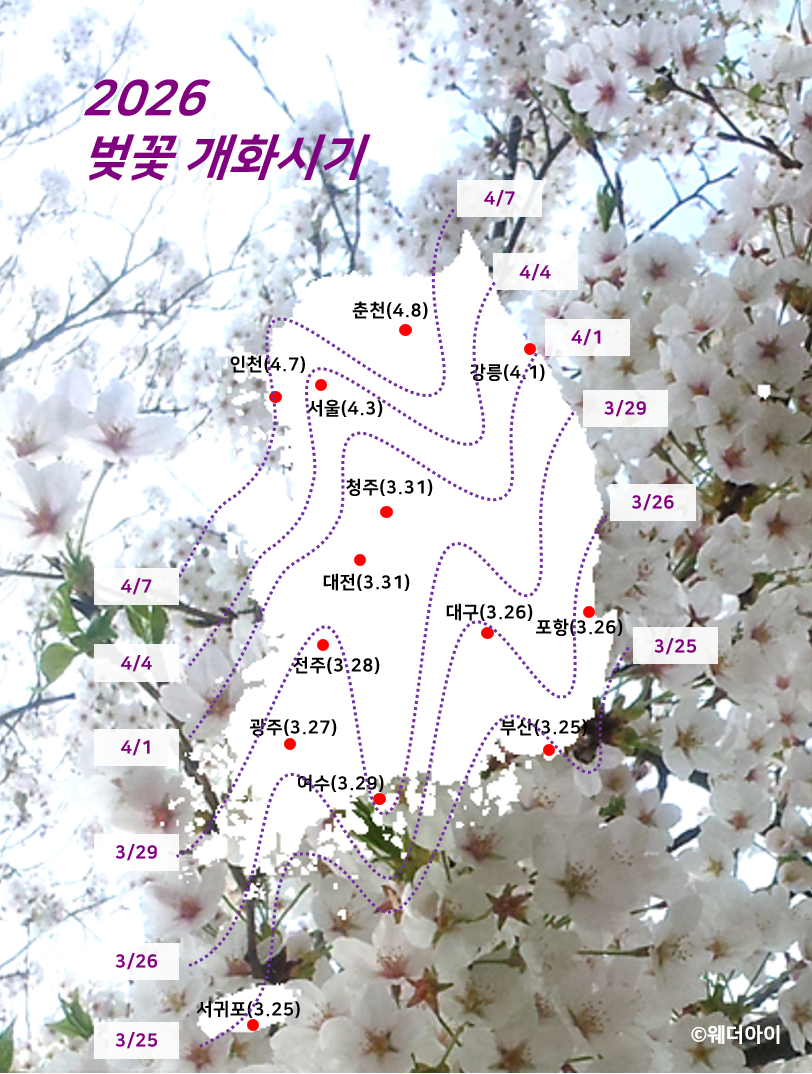 위의 표에서 보시다시피, 2026년에는 3월 27일 경에 벚꽃이 개화하기 시작하여, 4월 2일 즈음에 가장 화려한 모습을 보일 것으로 예측됩니다. 이 시기에는 서울 전역에서 짙은 분홍빛 벚꽃이 만개하게 되어 많은 이들의 마음을 사로잡을 것입니다.
