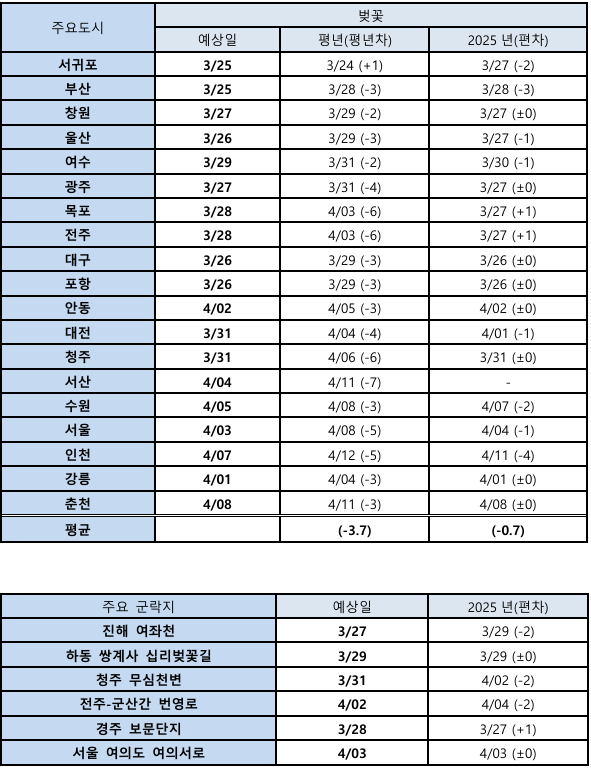 | 연도 | 예상 개화 시작일 | 최대 만개일 | 주요 벚꽃 명소 |